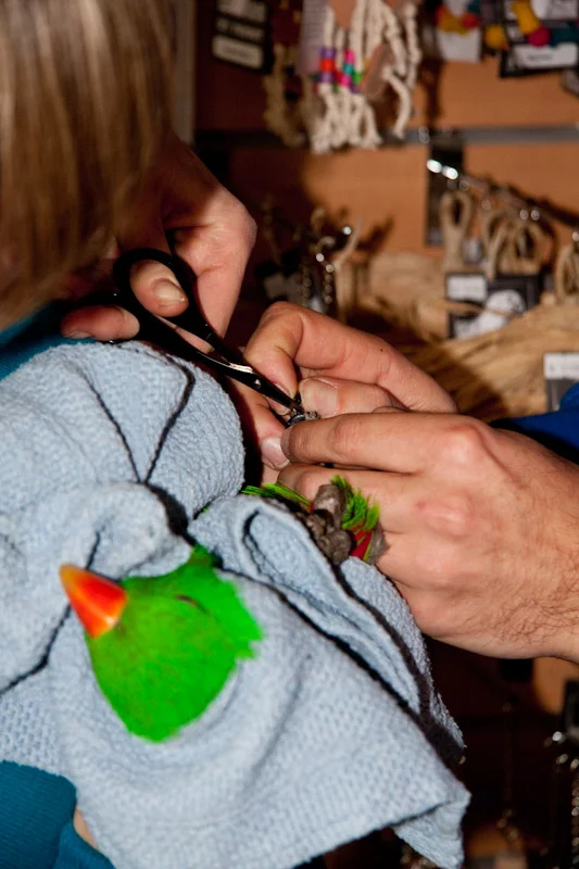 Wing clips via your vet should allow your bird to fly. We feel that this is the most appropriate technique. During nail clipping, our staff will discuss appropriate perching options to allow your parrot to naturally manage nail growth.